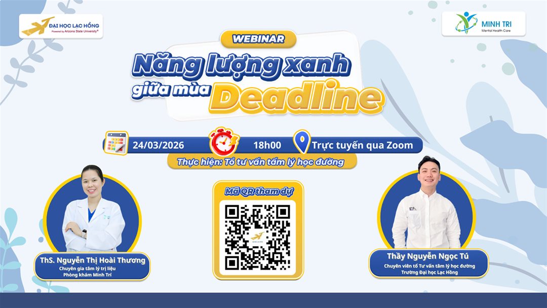Hãy dành một buổi tối để “sạc lại pin tinh thần” cùng chương trình Webinar: Năng lượng xanh giữa mùa Deadline do Tổ Tư vấn Tâm lý học đường – Trường Đại học Lạc Hồng phối hợp với Phòng khám Tâm lý Minh Trí tổ chức.