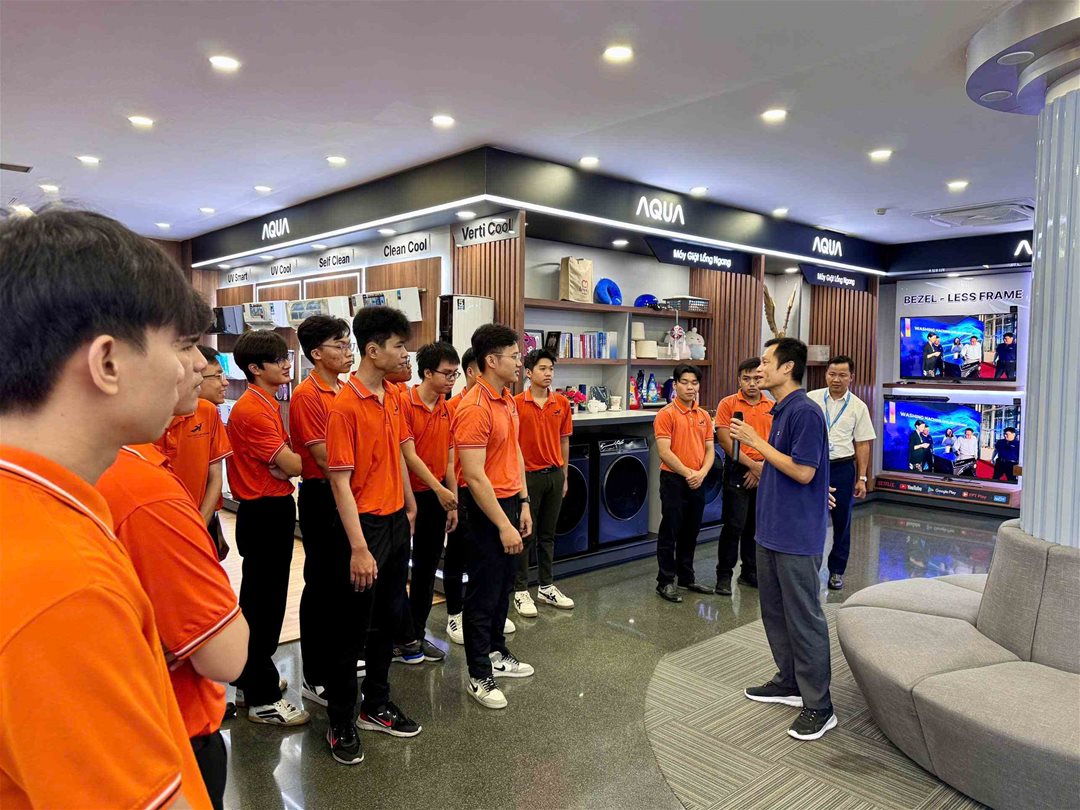 Tại buổi tham quan, sinh viên được đại diện công ty giới thiệu tổng quan về lịch sử hình thành và phát triển của thương hiệu AQUA, một trong những doanh nghiệp điện tử hàng đầu Việt Nam, thuộc tập đoàn Haier Group . Với hơn 25 năm hoạt động tại Việt Nam, AQUA đã không ngừng mở rộng quy mô sản xuất, khẳng định vị thế thương hiệu thông qua các sản phẩm gia dụng chất lượng cao như tủ lạnh, máy giặt, máy điều hòa và nhiều dòng sản phẩm điện tử tiên tiến khác, đáp ứng tiêu chuẩn quốc tế.