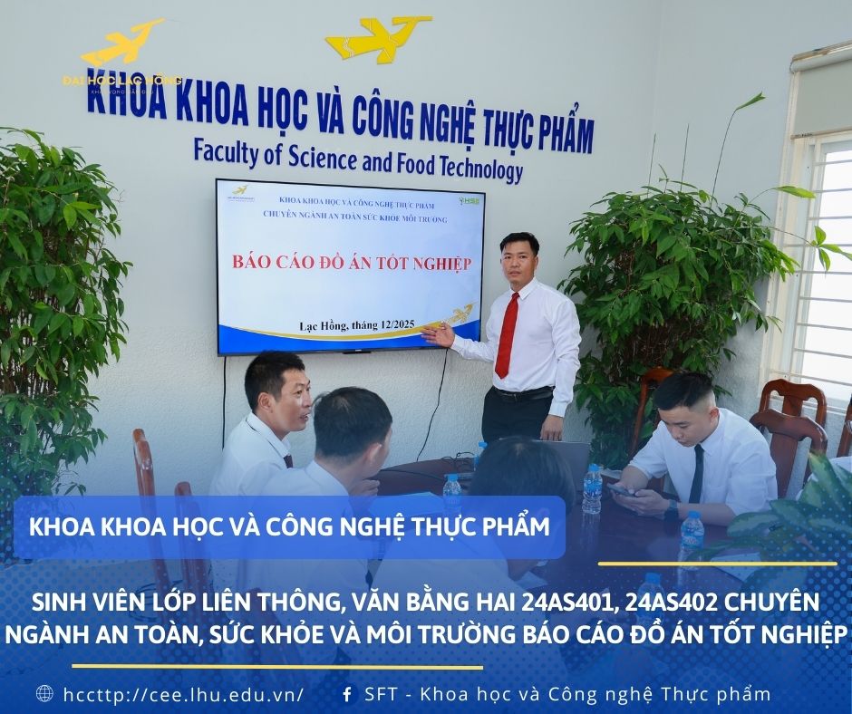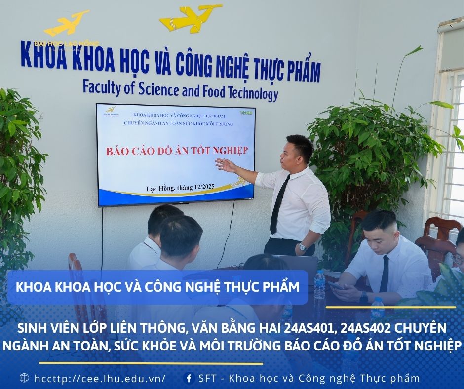 Ngày 13/12/2025 tại phòng I 408, Khoa Khoa học và Công nghệ Thực phẩm đã tổ chức buổi báo cáo đồ án tốt nghiệp cho các lớp 24AS401, 24AS402 hệ liên thông, văn bằng hai chuyên ngành An toàn, Sức khỏe và Môi trường. Đây không chỉ là dấu mốc quan trọng khép lại hành trình học tập miệt mài của các học viên, mà còn là dịp khẳng định chất lượng đào tạo và định hướng gắn kết chặt chẽ giữa lý thuyết và thực tiễn của Khoa.