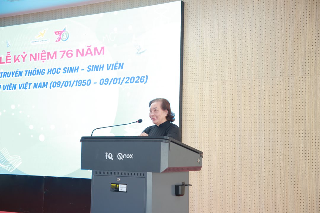 Tại chương trình, NGƯT.TS Nguyễn Thị Thu Lan – Bí thư Đảng ủy, Phó Hiệu trưởng Nhà trường đã có bài phát biểu ôn lại truyền thống vẻ vang của Hội Sinh viên Việt Nam qua 76 năm hình thành và phát triển, đồng thời ghi nhận, biểu dương những nỗ lực, đóng góp của các thế hệ sinh viên Trường Đại học Lạc Hồng trong thời gian qua. Qua đó, cô cũng khích lệ tinh thần sinh viên Lạc Hồng tiếp tục ra sức thi đua học tập, rèn luyện bản thân, phát huy tinh thần xung kích, sáng tạo, đóng góp tích cực cho sự phát triển của Nhà trường và xã hội.