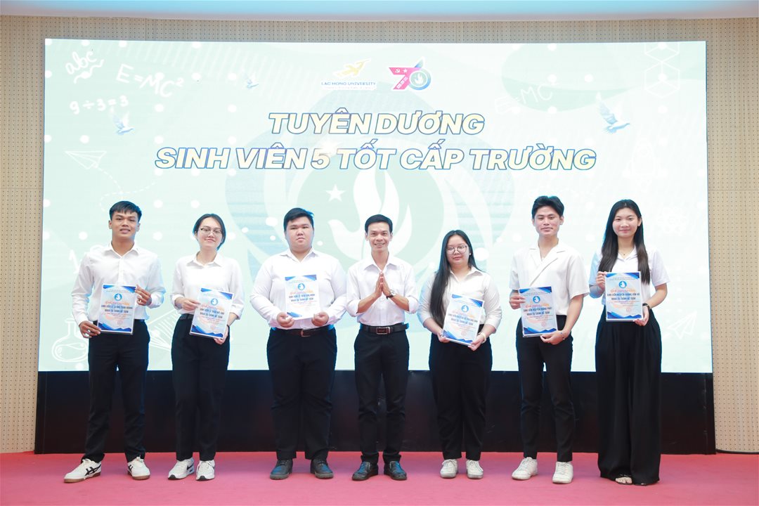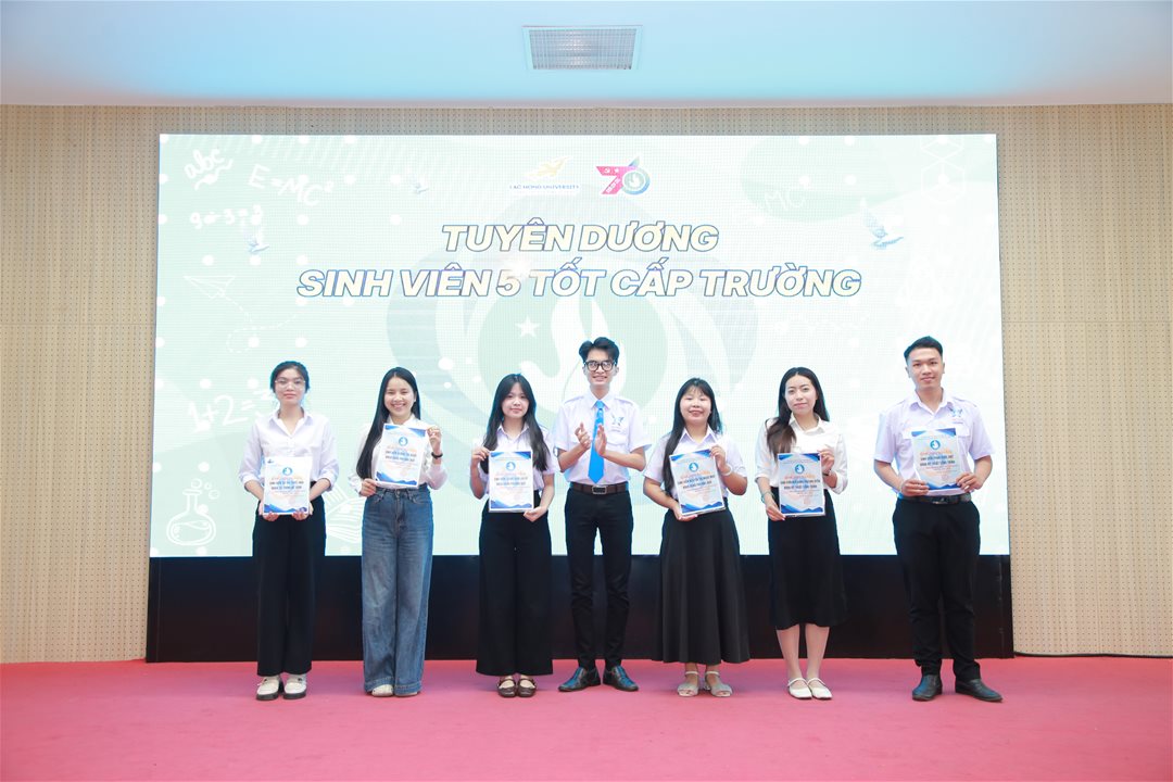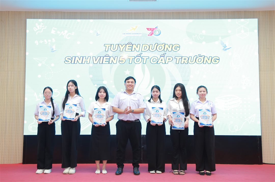 Đồng thời, Hội Sinh viên Trường đã trao Giấy chứng nhận Danh hiệu “Sinh viên 5 Tốt” cấp Trường năm học 2024 – 2025 cho 53 sinh viên xuất sắc – những tấm gương tiêu biểu trong học tập, rèn luyện đạo đức, thể lực, tình nguyện và hội nhập, góp phần lan tỏa hình ảnh sinh viên Lạc Hồng năng động, bản lĩnh và trách nhiệm.