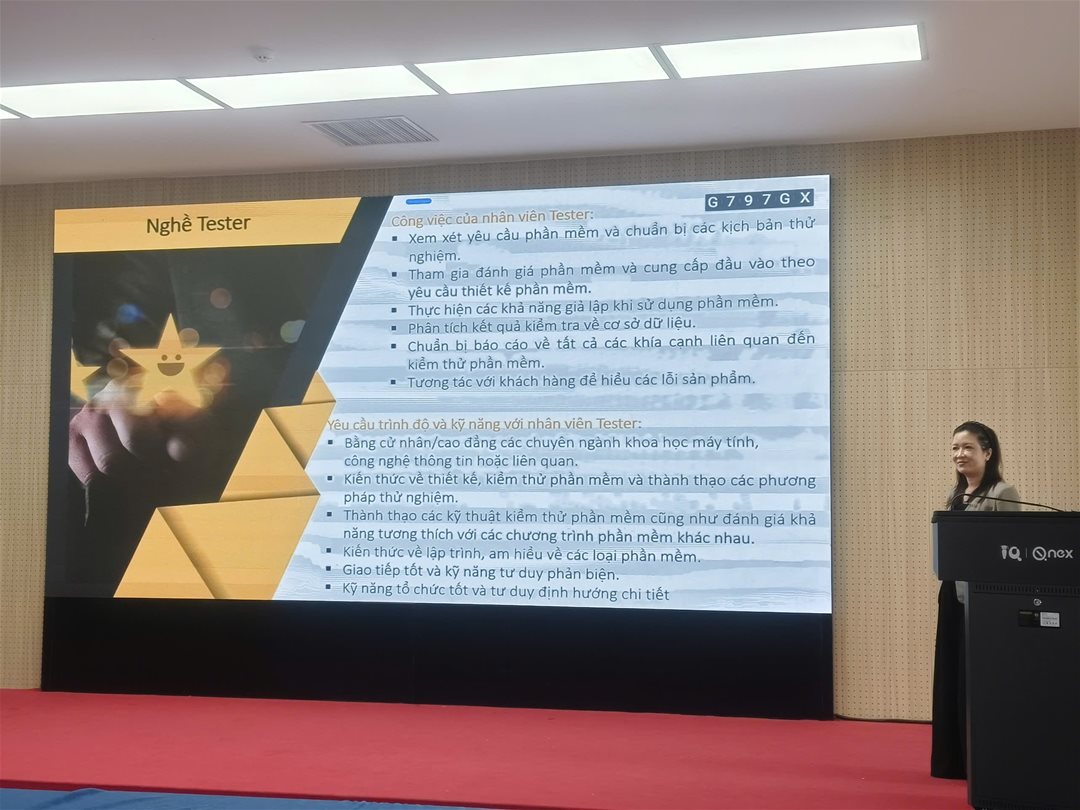 Bên cạnh đó, cô còn giới thiệu các xu hướng ứng dụng Trí tuệ nhân tạo (AI) trong kiểm thử, tự động hóa quy trình, và tối ưu hóa trải nghiệm người dùng – những kỹ năng đang được các doanh nghiệp công nghệ hàng đầu quan tâm.