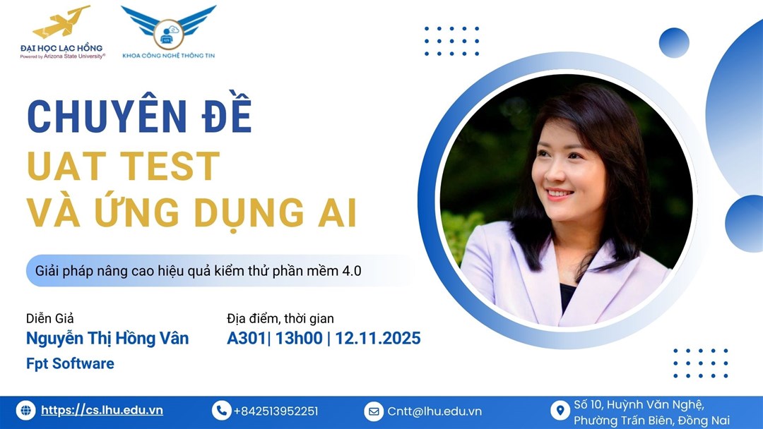 Chiều ngày 12/11/2025, Khoa Công nghệ Thông tin – Trường Đại học Lạc Hồng đã tổ chức buổi chuyên đề “UAT Test & Ứng dụng AI” dành cho sinh viên các khóa, với sự đồng hành của cô Nguyễn Thị Hồng Vân – chuyên gia đến từ FPT Software HCM.
