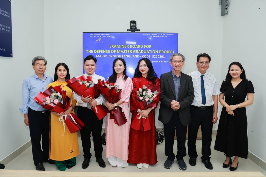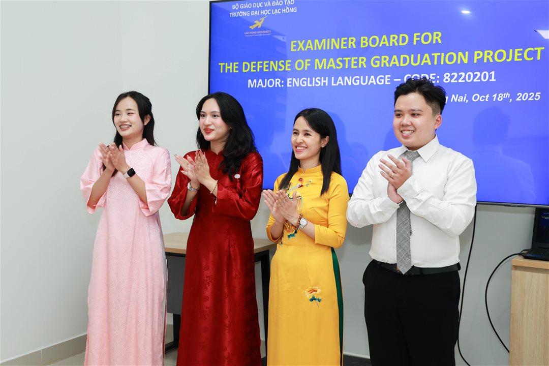 Ngày 18 tháng 10 năm 2025, tại Phòng Tiến sĩ (B107) của Trường Đại học Lạc Hồng, 04 học viên ngành Ngôn ngữ Anh đã bảo vệ và hoàn thành xuất sắc đồ án tốt nghiệp thạc sĩ của mình. Buổi bảo vệ diễn ra dưới sự đánh giá của Hội đồng chuyên môn, bao gồm các chuyên gia trong lĩnh vực Ngôn ngữ Anh, những người đã đưa ra các nhận định sâu sắc và mang tính học thuật cao.