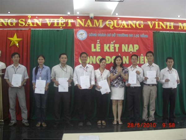 Sáng nay , Thứ sáu 28-5-2010 tại phòng B203 , Công đoàn cơ sở Trường Đại học Lạc Hồng đã làm Lễ kết nạp cho 30 Công đoàn viên mới .Đến dự lễ , có Thầy Diệp Cẩm Thu , Phó Hiệu trưởng kiêm  Chủ tịch công đoàn; Thầy Trần Minh Mẫn, Phó chủ tịch Công đoàn ; Cô Hồ Thị Hải Yến ,Trưởng ban Nữ công ; các Tổ trưởng Công đoàn và 30 anh chị CB,GV,NV được kết nạp trong đợt này .