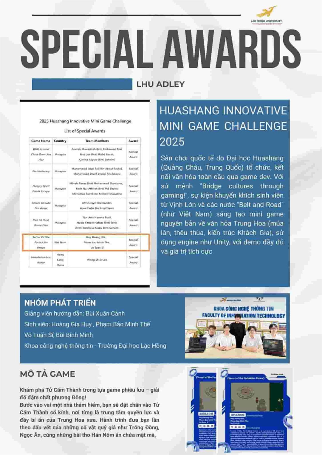 Trên đấu trường công nghệ quốc tế, nơi chỉ những ý tưởng táo bạo và đột phá mới có thể chinh phục. Với Hoàng Gia Huy, Phạm Bảo Minh Thế, Bùi Bình Minh, Võ Tuấn Sĩ thành viên và Bùi Xuân Cảnh Giảng viên hướng dẫn, đội LHU Adley – Khoa Công nghệ Thông tin, Trường Đại học Lạc Hồng (LHU) đã làm nên kỳ tích tại Huashang Innovative Mini Game Challenge 2025. Trước đó, LHU Adley là đại diện duy nhất của Việt Nam lọt top 5 và giành Giải Đặc Biệt (Special Award).