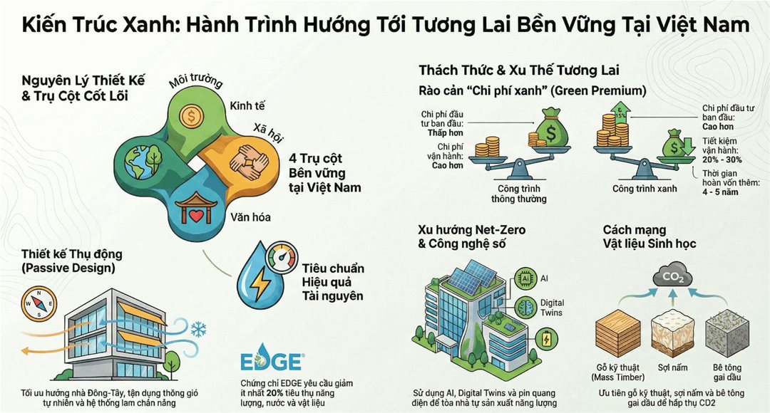 Thiết kế công trình xanh dựa trên nguyên tắc cốt lõi là thiết kế sinh khí hậu (passive design), tận dụng tối đa điều kiện tự nhiên để giảm phụ thuộc vào năng lượng nhân tạo.