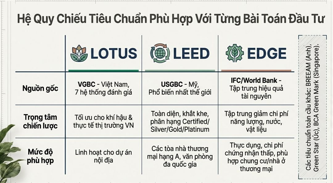 Để đánh giá mức độ “xanh” của công trình, nhiều hệ thống chứng nhận quốc tế đã được áp dụng rộng rãi: