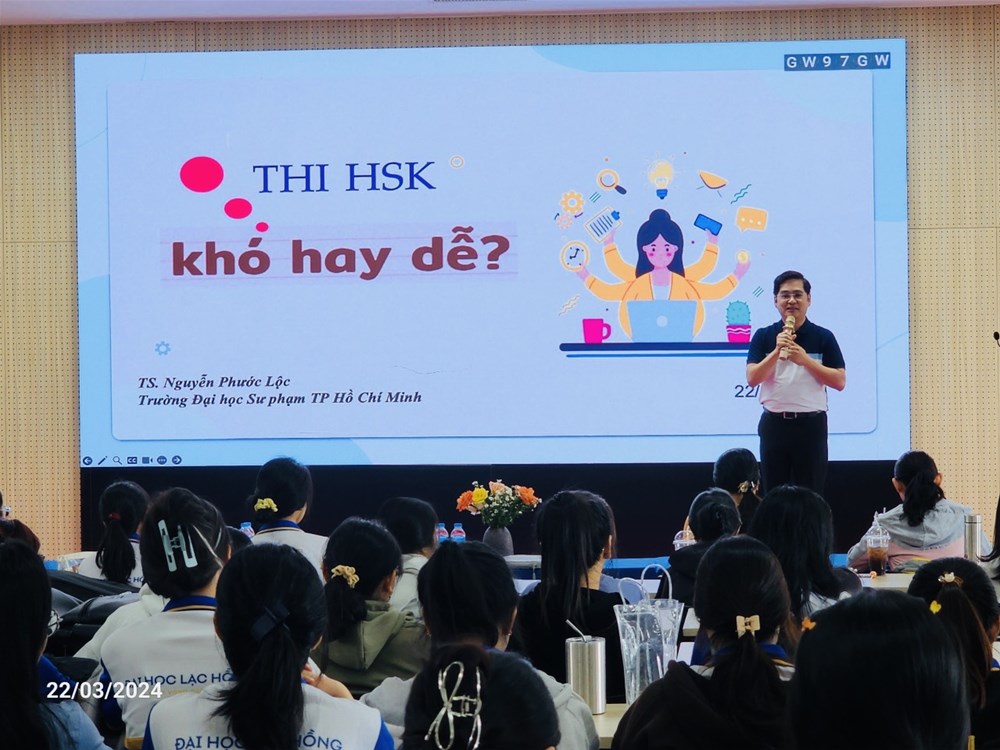 On March 22, 2024, at Hall A301, Campus 1, LHU, the Department of Chinese Language under the Faculty of Oriental Studies organized a talkshow "Is the HSK exam easy or difficult?" with the presentation of speaker Nguyen Phuoc Loc, Vice Dean of the Faculty of Chinese Language, VNU-HCMC University of Education.