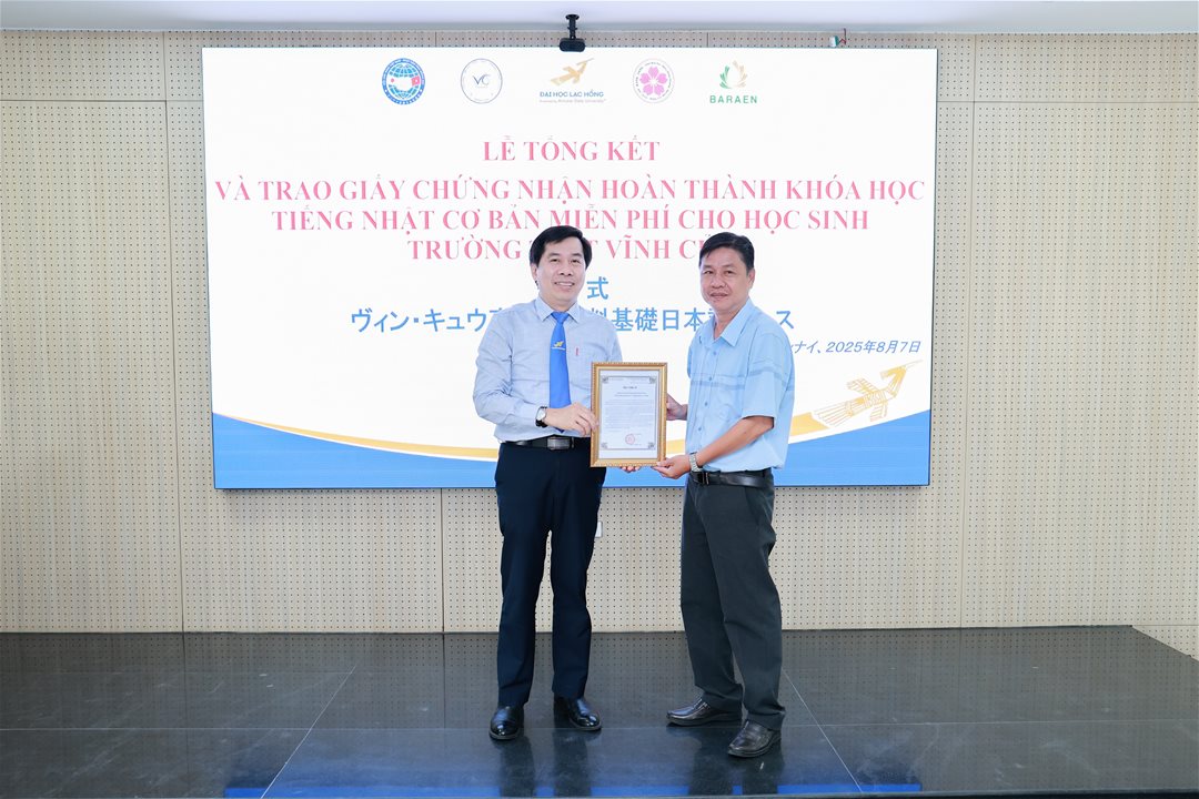 Mr. Nguyen Van Quyet – Chairman of the Vietnam – Japan Friendship Association of Dong Nai Province (left), and Mr. Kato Takayuki – Deputy Head of the Training Department at Baraen Co., Ltd. presenting certificates to the students