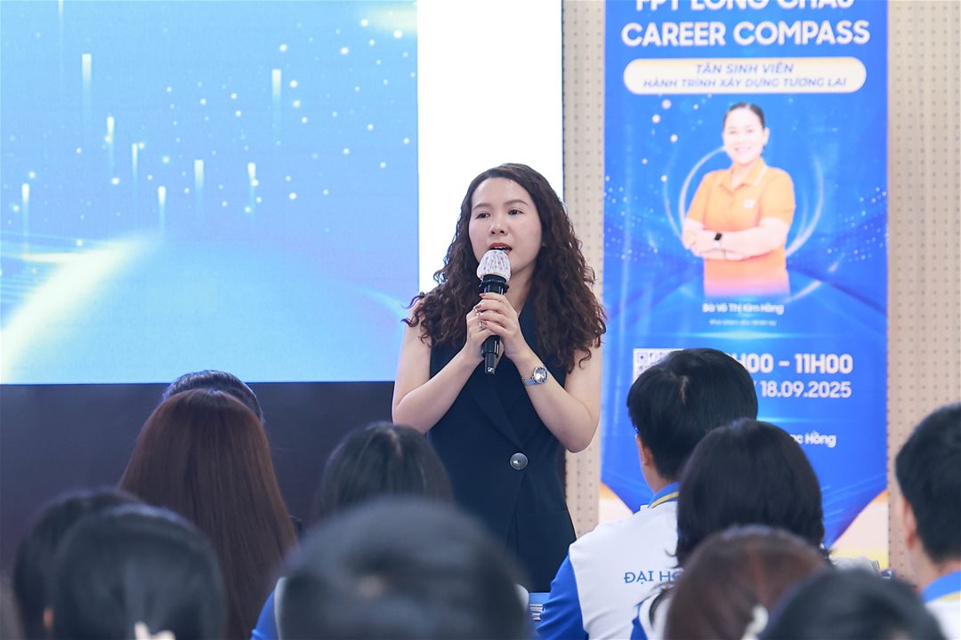 Đại diện FPT Long Châu Bà Võ Thị Kim Hồng – Phó Giám đốc Nhân sự đã chia sẻ nhiều câu chuyện thực tiễn xoay quanh cơ hội nghề nghiệp trong ngành dược, xu hướng phát triển của lĩnh vực này, đồng thời cung cấp những kinh nghiệm hữu ích giúp sinh viên định hướng lộ trình nghề nghiệp ngay từ năm đầu đại học.