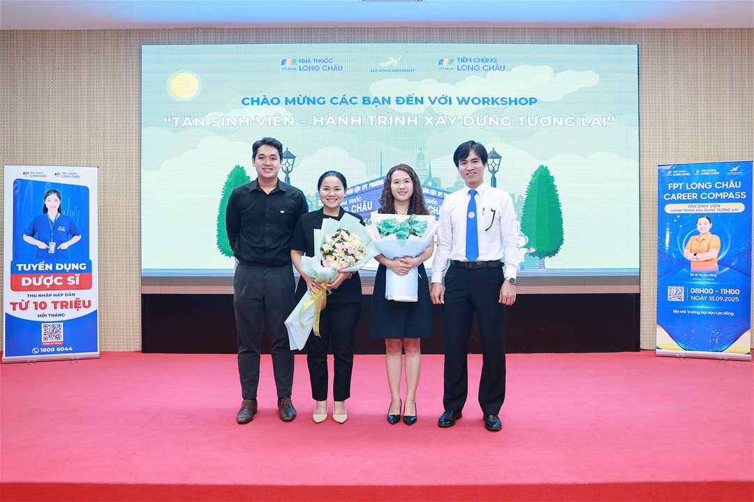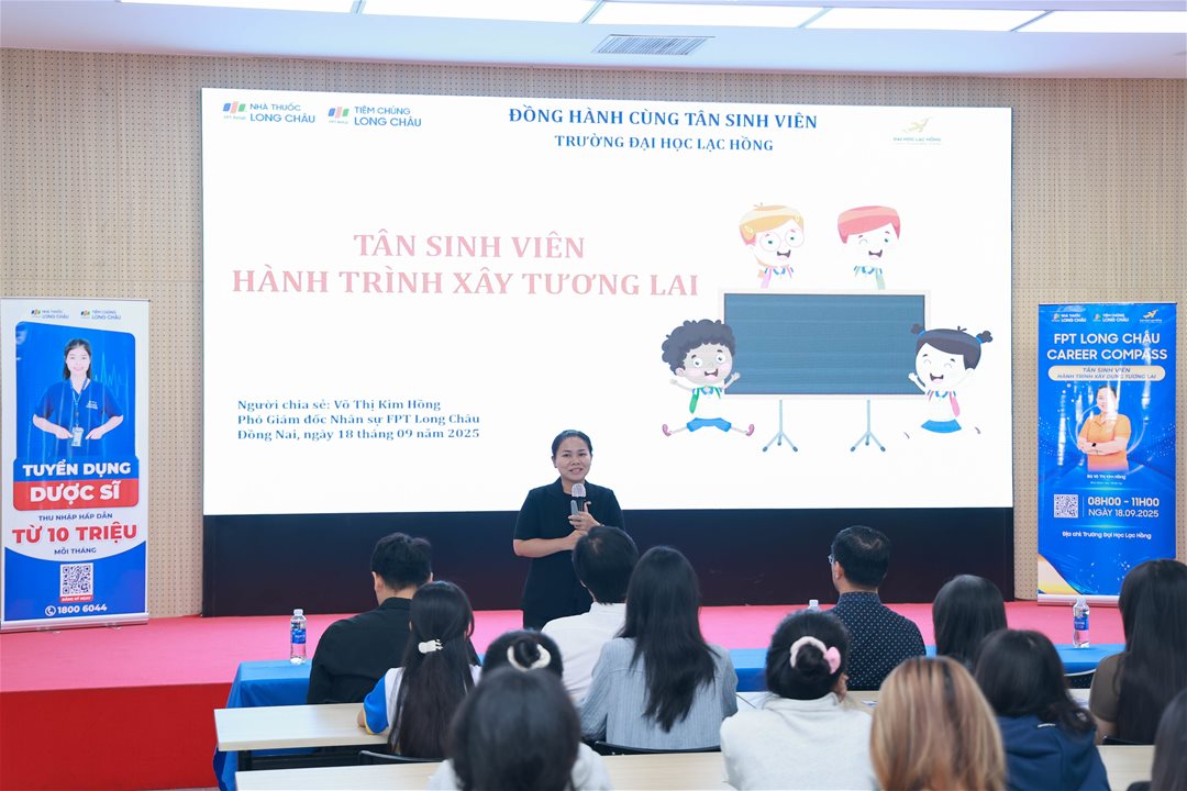 Ngày 18/09/2025, tại hội trường A301, Trường Đại học Lạc Hồng đã tổ chức buổi workshop chuyên đề với chủ đề “Tân sinh viên - Hành trình xây dựng tương lai” với sự đồng hành của đại diện từ Công ty Cổ phần Dược phẩm Long Châu – đơn vị uy tín trong lĩnh vực chăm sóc sức khỏe và phân phối dược phẩm.
