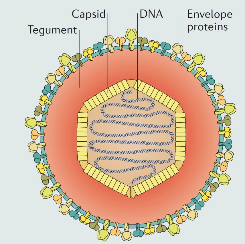 • Tegument: là lớp protein nằm giữa vỏ bọc và capsid, chứa nhiều protein chức năng tham gia vào quá trình sao chép và điều hòa biểu hiện gen của virus sau khi xâm nhập vào tế bào chủ.